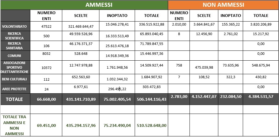 I beneficiari sono 58.636 enti tra volontariato, ricerca sanitaria e scientifica, associazioni sportive dilettantistiche, beni culturali e paesaggistici ed enti gestori delle aree protette, cui s’aggiungono 8.032 Comuni a cui sono stati destinati 14,9 milioni di euro. Il totale, tra ammessi e non ammessi, è di 510 milioni di euro, esaurendo così le risorse stanziate dal Governo, il che fa pensare che anche quest’anno le scelte dei contribuenti siano state superiori a tale importo e le cifre riconosciute agli enti siano state decurtate (vedi tabella).