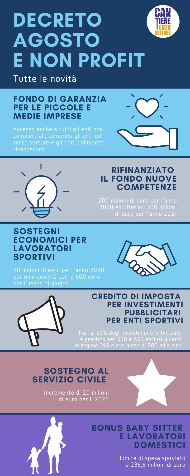 In un’infografica le principali misure approvate lo scorso 14 agosto 2020. Fondo di garanzia, servizio civile, sostegno per lavoratori sportivi, credito di imposta per investimenti pubblicitari ma anche rifinanziamento del fondo per le nuove competenze e bonus baby sitter